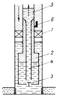 Установка с камерой замещения и двухрядным подъемником показана на рис. 9.22. На конце внешнего первого ряда труб 3 спускается камера замещения 1 для накопления в ней жидкости. Обратный клапан 2 предохраняет пласт от воздействия сжатого газа в периоды продавки скважины. Приток жидкости при этом не приостанавливается, так как вся притекающая жидкость накапливается не только в камере замещения, но и в межтрубном пространстве 6. Автомат-отсекатель 5, установленный на подводящей газовой линии и снабженный программным устройством, в определенные моменты времени открывает доступ газа в пространство между первым и вторым рядами труб. Жидкость из камеры 1 выдавливается во второй внутренний ряд труб 4. После выброса жидкости и падения давления нагнетаемого газа автомат-отсекатель перекрывает доступ газа на период накопления жидкости.Преимуществом этой схемы является непрерывный приток жидкости из пласта в скважину и уменьшение потерь газа при разрядке за счет малого объема межтрубного пространства между рядами труб по сравнению с объемом обсадной колонны. К недостаткам следует отнести наличие двух рядов труб и специального автомата-отсекателя на газовой линии.
