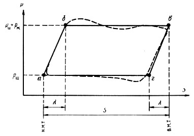 Линия аб означает деформацию штанг и труб и отражает процесс воспринятия штангами нагрузки от веса жидкости. Это происходит при перемещении штока на величину λ, начиная от н. м. т.