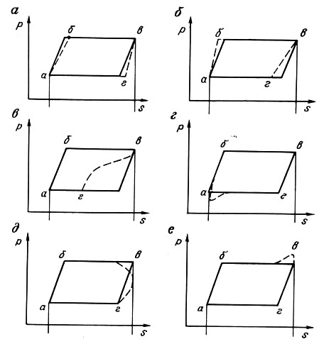 Реальная динамограмма всегда отличается от теоретической. Превышение пунктира над линией бв означает появление дополнительных нагрузок, связанных с инерцией системы и трением, этим же объясняется снижение пунктирной линии по отношению к линии га при ходе вниз. Изучение снятой динамограммы и ее сопоставление с теоретической позволяет выяснить ряд дефектов и неполадок в работе ШСНУ. Так, смещение точек б и г вправо означает пропуски в нагнетательной части насоса в результате растягивания во времени процесса перехода нагрузки Рж с труб на штанги. пропуск в нагнетательной части приводит к заполнению объема цилиндра, высвобождаемого плунжером, перетекающей жидкостью и, таким образом, создает на плунжер подпор снизу. Чем больше утечки в нагнетательной части, тем сильнее смещение точек б и г вправо.
