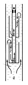 Условие эффективной работы газового якоря - Vг > V1. В противном случае газовые пузырьки будут увлекаться потоком жидкости в насос. Если на Vг мы практически не можем воздействовать, то скоростью V1 можно управлять. Ее можно уменьшить разделением потока Q на два или более параллельных потоков. Это осуществляется в двух-, трех- или четырехкорпусных якорях (рис. 10.16). В каждую секцию якоря попадает только часть общего расхода. Это означает, что нисходящая скорость потока V1 в корпусе якоря будет меньше.