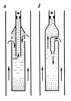 Другим фактором, осложняющим работу штанговых насосных установок, является присутствие в откачиваемой жидкости мелкого песка и иной абразивной взвеси. Песок, попадая в насос, разрушает пригнанные поверхности деталей насоса, увеличивает утечки жидкости через клапаны и зазор между цилиндром и плунжером, а иногда вызывает заклинивание плунжера и обрывы штанг. Такие явления наблюдались в неглубоких скважинах нефтяных районов южной Туркмении и Северного Кавказа. Межремонтный период таких скважин составляет несколько недель, после чего необходимы извлечение подземного оборудования и замена насоса. Для борьбы с вредным влиянием песка применяются различные меры, например, крепление призабойной зоны скважины различными смолами, образующими после их кристаллизации на забое прочную проницаемую пористую среду. Для тех же целей используют различные фильтры, а также приспособления, устанавливаемые перед приемным патрубком насоса, называемые песочными якорями. В песочном якоре (рис. 10.18, а) жидкость изменяет направление движения на 180°, песок отделяется и скапливается в специальном кармане в нижней части якоря. При заполнении кармана песком якорь извлекают на поверхность и очищают. Условием эффективной работы песочного якоря является существование в якоре скорости восходящего потока жидкости, меньшей скорости оседания частиц песка. По опытным данным эффективность обращенного якоря (рис. 10.18, б) выше прямого, так как в нем благодаря насадке создается повышенная скорость потока с песком, направленная вниз. В результате условия оседания песка улучшаются.