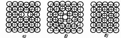 | а) – вакансия, б) – межузельный атом, в) – чужеродный атом |