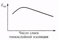 При использовании двух слоев изоляции Епр возрастает, так как уменьшается вероятность попадания слабых (дефектных) мест под электроды,. С увеличением числа слоев изоляции Епр вначале повышается до определенного числа слоев (слабые места перекрываются здоровыми), а затем снижается, из-за ↑ неоднородности диэлектрика больше воздуха между листами бумаги),