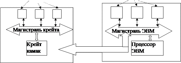 КАМАК удачно объединяет в себе, с одной стороны, богатый набор электронных функциональных модулей самого разнообразного назначения (усилители, счетчики, таймеры, аналого-цифровые преобразователи, запоминающие устройства и т.д.), а с другой стороны – средства связи всей этой аппаратуры с ЭВМ, для чего предусмотрен специальный управляющий модуль –контроллер КАМАК. Характерным для системы КАМАК является наличие унифицированного канала передачи данных (магистрали) между отдельными модулями и контроллером. И модули, и контроллер имеют выход на магистраль, по линиям которой происходит обмен рабочей и служебной информацией, а также питание модулей: контроллер кроме того связан с ЭВМ (рис 10). Всеми процессами на магистрали управляет (по командам от ЭВМ) контроллер, однако если в модуле возникла ситуация, требующая вмешательства ЭВМ, модуль может послать в контроллер запрос на обслуживание и иницировать тем самым конкретную программу обработки.
