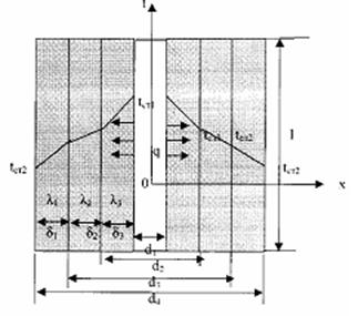 Температура внутренней поверхности стенки – tст1, температура наружной поверхности стенки –tст2, коэффициенты теплопроводности слоев -λ1, λ2, λ3, диаметры слоев d1, d2, d3, d4. Тепловые потоки для слоев будут: