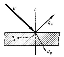 Каждое тело способно не только излучать, но и отражать, поглощать и пропускать через себя падающие лучи от другого тела. Если обозначить общее количество лучистой энергии, падающей на тело, через Q, то часть энергии, равная А, поглотится телом, часть, равная R, отразится, а часть, равная D, пройдет сквозь тело. Отсюда Q = QA + QR + QD)
