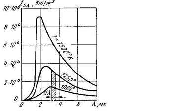 Закон Стефана-Больцмана. Планк установил, что каждой длине волны соответствует определенная интенсивность излучения, которая увеличивается с возрастанием температуры. Тепловой поток, излучаемый единицей поверхности черного тела в интервале длин волн от λ до λ + dλ, может быть определен из уравнения: dEs = Isλ*dλ.