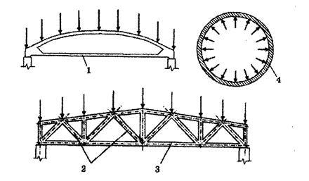 Рисунок 12.1 – Центрально растянутые элементы: 1 – затяжка арки; 2 – нисходящие раскосы фермы; 3 – нижний пояс фермы; 4 – стенка круглого в плане резервуара
