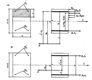 Рисунок 12.3 – Расчетные схемы внецентренно растянутых элементов при расположении продольной растягивающей N: а – за пределами расстояния между равнодействующими усилий в арматуре Аs и A’s; б – между равнодействующими усилий в арматуре Аs и A’s