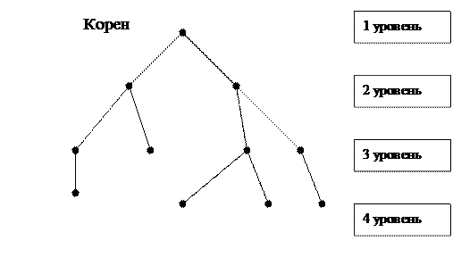 Основной структурой представления информации в иерархической модели данных является дерево. Дерево определяют как связный граф, не имеющий циклов. (Граф – это математическая конструкция, состоящая из вершин и рёбер) Все вершины разбиты на уровни. На самом высшем уровне находится только одна вершина, которая называется корнем дерева. Любой уровень можно достигнуть через корень дерева. Он соединяется рёбрами со всеми вершинами, находящимися на втором уровне, и только с ними. Вершины второго уровня соединяются с вершинами третьего уровня так, что каждая вершина третьего уровня соединяется только с одной вершиной второго уровня и т.д. Графическое изображение дерева имеет следующий вид (Рис. 2):
