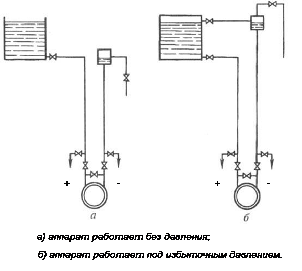 При измерении уровня в аппарате, работающем без давления, уравнительный сосуд устанавливают в одной горизонтальной плоскости с нижней точкой отбора так, чтобы уровень жидкости в уравнительном сосуде был всегда постоянным. Плотность жидкости в уравнительном сосуде должна быть такой же, как и плотность жидкости в самом аппарате.
