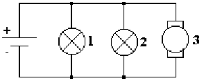 Электрическая схема - это графическое изображение электрической цепи, включающее в себя условные обозначения устройств и показывающее соединение этих устройств. На рис. 1.1 изображена электрическая схема цепи, состоящей из источника энергии, электроламп 1 и 2, электродвигателя 3.
