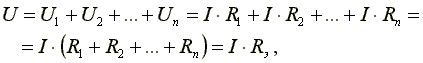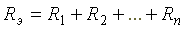 Эквивалентное сопротивление электрической цепи, состоящей из n последовательно включенных элементов, равно сумме сопротивлений этих элементов.