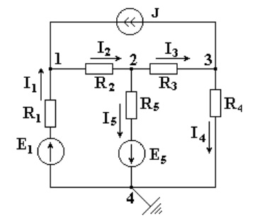 Метод узловых потенциалов позволяет составить систему уравнений, по которой можно определить потенциалы всех узлов схемы. По известным разностям узловых потенциалов можно определить токи во всех ветвях. В схеме на рисунке 4.3 имеется четыре узла. Потенциал любой точки схемы можно принять равным нулю. Тогда у нас останутся неизвестными три потенциала. Узел, величину потенциала которого выбирают произвольно, называют базисным. Укажем в схеме произвольно направления токов. Примем для схемы?4 = 0.