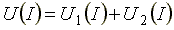 При параллельном соединении двух нелинейных элементов (рис. 5.8) ток в неразветвленной части электрической цепи равен сумме токов в параллельных определенных ветвях. Поэтому при построении результирующей ВАХ всей цепи следует суммировать ординаты графиков 1 и 2 (рис. 5.9), соответствующие одним и те же значениям напряжения, так как к этим нелинейным элементам приложено одно и то же напряжение, равное напряжению внешней сети, т.е. источника питания. Например, для произвольного значения напряжения
