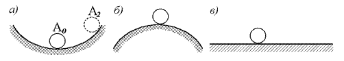 Здесь, в рисунке а), А0 – невозмущенное состояние, А2 – возмущенное состояние; на рисунке б) изображено неустойчивое состояние системы, а на рисунке в) – ее нейтральное состояние. По аналогии с состояниями можно ввести понятие возмущенного и невозмущенного движения.