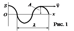 На рис.1 представлена гармоническая поперечная волна, распространяющаяся со скоростью v вдоль оси x, т.е. приведена зависимость между смещением S частиц среды и расстоянием х этих частиц от источника колебаний О для фиксированного момента времени t.