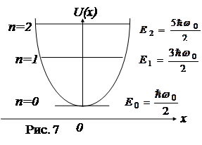 x2/2; в точках с координатами ±хmax она равна полной энергии Е. Т.о., энергия частицы могла принимать любые значения, т.е. изменяться непрерывно (рис.6).