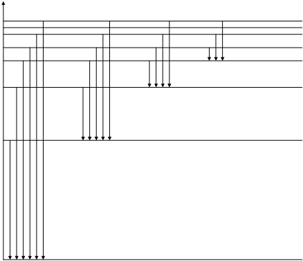 При переходе электрона с более высоких энергетических уровней на уровень n=1 возникает ультрафиолетовое излучение или излучение серии Лаймана (СЛ). Когда электроны переходя на уровень n = 2 возникает видимое излучение или излучение серии Бальмера (СБ). При переходе электронов с более высоких уровней на уровень n = 3 возникает инфракрасное излучение, или излучение серии Пашена (СП) и т.д.