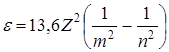 Частоты или длины волн, возникающего при этом излучения, определяются по формулам (8) или (9) при m= 1 – для серии Лаймана, при m= 2 – для серии Бальмера и при m = 3 – для серии Пашена. Энергия фотонов определяется по формуле (7), которую с учетом (6) можно привести для водородоподобных атомов к виду: