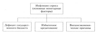 Рассматривая инфляцию как результат взаимодействия денежных факторов (спроса) и реальных факторов (предложения), возможно конкретизировать вызывающие ее причины. Инфляцию спроса вызывают три основных денежных фактора или источника (рис. 3). Инфляция издержек (предложения) неразрывно связана с неденежными факторами (рис.4).