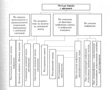 Инфляция оказывает отрицательное влияние на развитие общества. В современной практике стран мира накоплен богатый опыт использования различных методов регулирования инфляционных процессов. Возможные варианты условной классификации основных методов антиинфляционной политики по отдельным признакам показаны на рис.5.