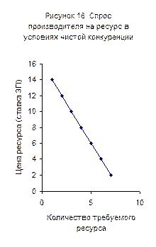 Факторы производства имеют свой рынок, на котором они продаются и покупаются, а цена на них устанавливается в соответствии с законом спроса и предложения. Самый простой метод определения спроса на ресурсы заключается в предположении, что фирма приобретает какой-то определённый ресурс на конкурентном рынке. При этом подчеркнём важный момент, состоящий в том, что спрос на ресурсы является ПРОИЗВОДНЫМ СПРОСОМ, т о есть производным от готовых товаров и услуг, которые производятся с помощью данных ресурсов.