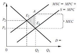 В точке Е2 последствия загрязнения окружающей среды полностью не устраняются, однако ущерб от загрязнения существенно сокращается. Площадь треугольника АЕ1Е2 показывает потери эффективности, связанные с тем, что предельные частные издержки оказались ниже предельных общественных издержек. Таким образом, при наличии отрицательного внешнего эффекта экономическое благо продается и покупается в большем объеме по сравнению с эффективным объемом, т.е. имеет место перепроизводство товаров.