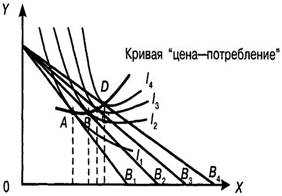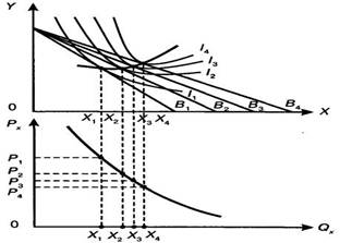 Кривая спроса. На основе кривых безразличия и бюджетных ограничений можно вывести обычную кривую спроса. На рис. 1 изображено, как поворачивается бюджетная линия, меняя свой наклон, в результате понижения цены товара X с Р1 до Р4. Каждая из соответствующих бюджетных линий касается особенной кривой безразличия. В каждом случае рациональный выбор потребителя представлен иным набором товаров Х и Y.
