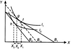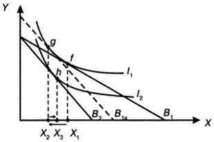 Графическое отображение эффекта дохода и эффекта замещения. Поведение потребителя непосредственно зависит от категории потребляемого товара. Рассмотрим так называемый нормальный товар. На рис. 3 изображена ситуация, при которой цена на нормальный товар X поднялась, следовательно, бюджетная линия сделала поворот от В1 к В2