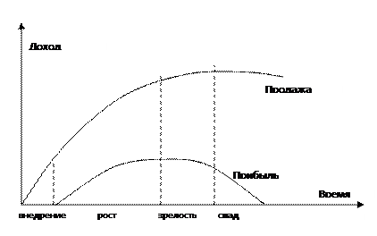 Важное значение имеет определение момента появления новой услуги на рынке. Осуществит это помогает концепция жизненного цикла услуги. Согласно этой концепции товар или услуга, подобно живому организму, рождается, живет и умирает. В своей рыночной жизни они проходят последовательно несколько фаз – внедрение, рост, зрелость, спад. Жизненный цикл товара или услуги можно графически изобразить следующим образом (Рис.4)