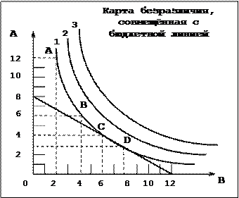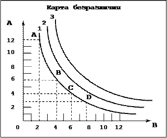 Пример: Допустим потребителю безразлично, в каком сочетании покупать продукты А и В, например 12 и 2, 6 и 4, или 3 и 8. Если, исходя из этих комбинаций, построить график, то получим кривую равных полезностей, то есть кривую безразличия. Все наборы из двух продуктов одинаково полезны для потребителя. Полезность, которую он теряет, отказываясь от какого-либо количества одного продукта, компенсируется пользой от дополнительного количества другого продукта. Но могут существовать такие наборы кривых безразличия, которые различаются по уровню полезности. Совокупность кривых безразличия называют картой безразличия. Чем дальше от начала координат находится кривая. Тем большую пользу она обеспечивает потребителю. Любая комбинация товаров А и В на кривой 3 будут иметь большую полезность, чем комбинация товаров А и В на кривых 1 и 2, однако доход потребителя ограничен, вследствие чего потребитель будет искать такой вариант сочетания продуктов, при котором польза в рамках дохода будет наибольшей. Такой вариант называют равновесным положением потребителя. Для его нахождения необходимо совместить бюджетную линию с картой безразличия. Кривые 2 и 3 обеспечивают потребителю большую полезность, но ему не доступны, так как находятся выше бюджетной линии. Равновесное положение потребителя достигается в точке С, где бюджетная линия касается кривой безразличия 1. Достигнув её потребитель теряет стимул к изменению структуры своих покупок, так как это будет означать потерю полезности.