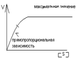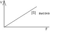 1. Зависимость скорости реакции от концентрации субстрата. Эта зависимость выявляется при малых концентрациях субстрата [S]<Km. В этом случае концентрацией субстрата в уравнении можно пренебречь и уравнение приобретает вид: V3 = K3*[F0]*[S] /Km. В данном уравнении K3, F0], Km – константы и могут быть заменены новой константой К*. Таким образом, при малой концентрации субстрата скорость реакции прямо пропорциональна этой концентрации V3 = K* * [S]. Эта зависимость соответствует первому участку графика 2.