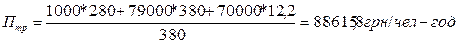 Пример расчета: Предприятие за год выпустило 10000 шт. изделий «А», по цене 280 грн/шт; 79000 изделий «Б» по цене 380 грн/шт.; и 70000 шт. изделий «В» по цене 12,2 грн/шт. Среднесписочная численность работников ППП составила 380чел.