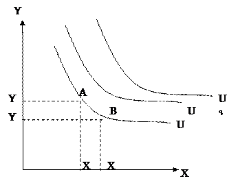 Кривая безразличия (линия равной полезности) – множество точек, каждая из которых, представляет собой такой набор двух товаров, что потребителю безразлично какой из этих наборов выбрать, поскольку их полезность одинакова.