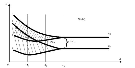 дискретных энергетических уровней, каждый из которых расположится в зонах между уровнями 1,2 и 3,4. Хотя эти образовавшиеся уровни и дискретны, но разница энергий между ними будет очень мала, поэтому в целом спектр этих энергий можно считать квазинепрерывным. Значения же энергий, принадлежащих запрещенным зонам, не могут реализовываться. Из рисунка видно, что в сечениях d1 и d2 между разрешенными зонами, имеются запрещенные зоны. (в d1-зона ∆W21, в d2 - зона ∆W23).