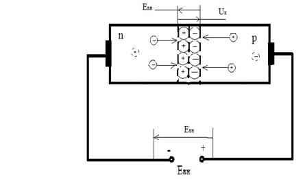 Если к p-n переходу подключить внешнее напряжение Eвн, полярность которого противоположна полярности контактной разности Uк потенциалов, то такое включение называется прямым (n-область подключается к отрицательному полюсу Евн, а p-область - к положительному полюсу Евн). При таком включении в p-n переходе появляется дополнительное внешнее электрическое поле, уменьшающее его внутреннее поле.