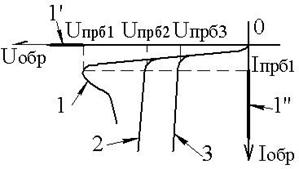 Разрушение p-n перехода при Uпрб1 (кривая1) завершается в итоге с равной вероятностью: или обрывом между омическими выводами перехода(1'); или коротким замыканием между этими выводами (сварка выводов) (1'').