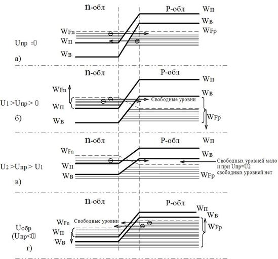 (рис.б), энергетическая диаграмма полупроводников n-типа поднимется вверх, а p -типа – опустится вниз. В этом случае уровни некоторых электронов n -области расположатся против свободных уровней валентной зоны p-области, и возникнут условия для туннельного перехода электронов из электронного полупроводника в дырочный.