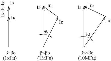 Второй причиной уменьшения усилительных свойств транзисторов на высоких частотах является отставание по фазе переменного тока IК от переменного тока IЭ, что обусловлено инерционностью процесса переноса носителей заряда через базу, а также инерционностью процессов накопления и рассасывания зарядов в базе.