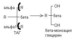 Впереваривании ТАГ участвует поджелудочная липаза. Она вырабатывается в неактивной форме, и в тонком кишечнике взаимодействует с дополнительным белком колипазой, который повышает активность липазы и обеспечивает контакт фермента с соответствующими жирами. Поджелудочная липаза отщепляет последовательно остатки жирных кислот из альфа-положении с образованием бета – моноацилглицерина (β -МАГ)