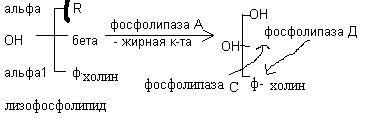 Под действием фосфолипазы А отщепляется остаток жирной кислоты в α – положении. Фосфолипаза С отрывает остаток фосфорной кислоты, а фосфолипаза Д – остаток холина. Таким образом, при полном распаде глицерофосфолипидов образуются глицерин, жирные кислоты, Н3РО4, холин.
