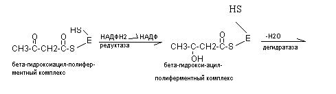 Затем ацетил - КоА и малонил - КоА соединяются с полиферментным комплексом (синтетаза жирных кислот), в котором имеется 2 SН-группы.