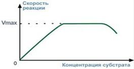 При увеличении концентрации субстрата скорость реакции сначала возрастает соответственно подключению к реакции новых молекул фермента, затем наблюдается эффект насыщения, когда все молекулы фермента взаимодействуют с молекулами субстрата. При дальнейшем увеличении концентрации субстрата между его молекулами возникает конкуренция за активный центр фермента и скорость реакции снижается.