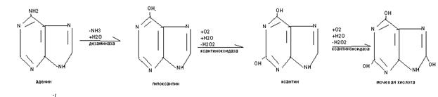 Распад пуриновых оснований происходит путём их гидролитического дезаминирования без разрыва пуринового кольца с образованием мочевой кислоты.