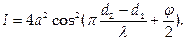 Монохроматические волны одинаковой частоты всегда когерентны и поэтому могут интерферировать. Результат интерференции определяется разностью фаз в месте наблюдения. Эта разность зависит от начальной разности фаз φ иот разности расстояний d 2– d 1, отделяющих точку наблюдения от источников каждой из волн. Если амплитуды каждой из волн одинаковы и равны а, то интенсивность результирующей волны дается выражением: