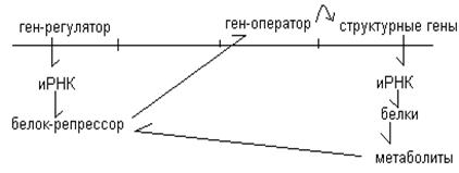 Наиболее подробно выяснена регуляция синтеза белка на микроорганизмах. Общепринятой является схема авторегуляции Моно и Жакоба. Согласно этой схеме, в молекуле ДНК выделяют ген-регулятор, который отвечает за синтез особой РНК и в последующем за синтез особого белка репрессора. На удалении от этого участка находятся ген-оператор и струрктурные гены. Структурные гены (цистроны) служат матрицей для синтеза иРНК, а в последующем – белков. Белки в процессе обмена образуют метаболиты. Метаболиты связываются с репрессором. Репрессор регулирует активность гена – оператора, который, в свою очередь, влияет на структурные гены.