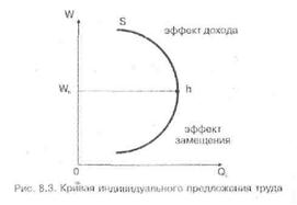 До определенного момента (Wh) рост заработной платы увеличивает предложение труда, которое достигает в точке h максимального значения. После же достижения максимального уровня по мере дальнейшего роста заработной платы предложение труда (количество отработанного времени) начинает сокращаться. Одна и та же причина (увеличение зарплаты) приводит и к росту и сокращению труда.