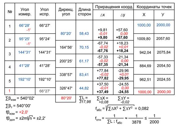 Допустимая угловая невязка fβдоп = 2m√n, где m – точность прибора, n – число углов хода