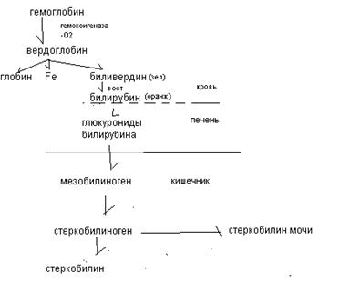 На первом этапе под действием гемоксигеназы происходит разрыв одного метинового мостика. Тетрапиррольная структура гемоглобина разворачивается и образуется вердоглобин. Вердоглобин расщепляется на глобин, железо и биливердин (пигмент зелёного цвета). Затем биливердин восстанавливается в билирубин (оранжево-желтый пигмент). Билирубин плохо растворим в воде и очень токсичен. Для транспорта гидрофобного билирубина в печень происходит его адсорбция на белках плазмы крови, вследствие чего повышается гидрофильность билирубина. Эта форма билирубина называется свободный билирубин (неконъюгированный), так как химически он с белками не связан или непрямой билирубин, так как он даёт цветную реакцию не сразу, а после осаждения белков.